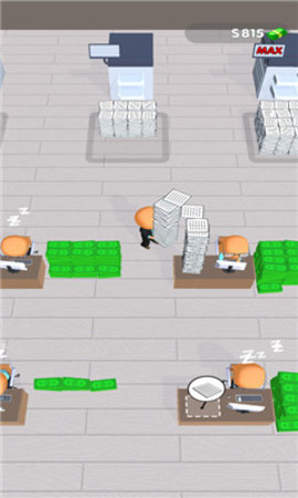 开始雇用工人并让他们处理文件,收集现金解锁新的办公区域并发现新的赚钱方式