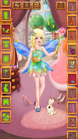 2、在这款美容院游戏中,你可以给小精灵穿上漂亮的裙子、夹克和鞋子