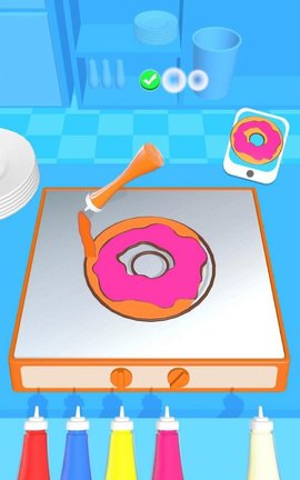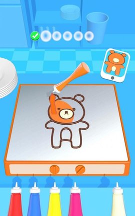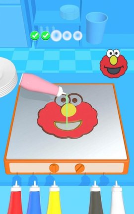 按照上面给出的煎饼样式制作煎饼,将对应颜色的面糊拖到对应位置,当光标变为绿色时,按住面糊,向外按面糊,可以做出更好的煎饼,最后撒上糖和粮食。