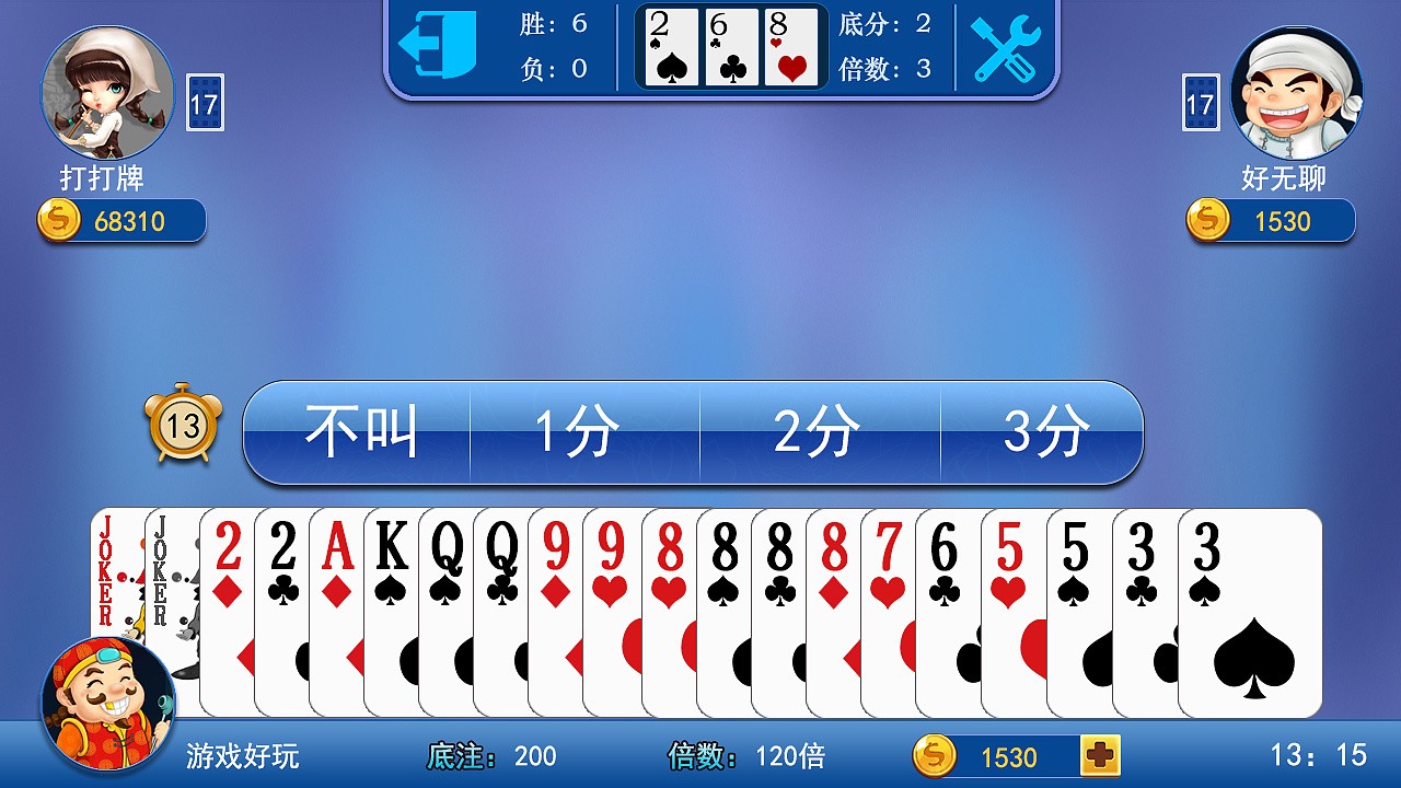 4、叫分:随机选择一个玩家开始依次叫分,玩家可以选择叫“1分”、“2分”、“3分”或者不叫分,所叫的分数必须比上一家高。