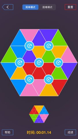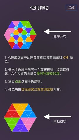 1、将六边形的色块排列在一个格子框中,色块在游戏中不能旋转,你必须完成移动才能拼图。