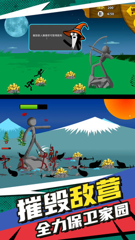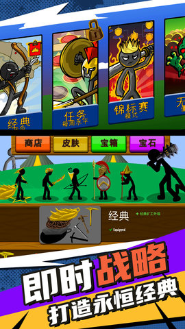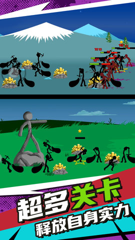 2、收集不同能力的火柴人,组成战斗单位,开采黄金或进行领土战争。