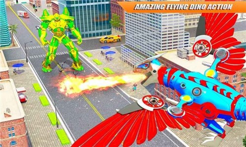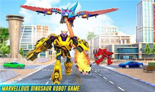 游戏中的变形金刚可以消灭恶霸,科幻的机甲战斗将在这里展现,邪恶的恐龙机器人正在摧毁城市,玩家可以利用自己的飞行能力迅速到达战场,与强大的恐龙机器人战斗,使用你的操作技能快速开火,无论怎样开火,只要是取得胜利的强者都可以。