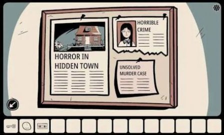 1、卡通绘画风格的推理解谜手机游戏,以灰色和黑色色调描绘游戏中的人物形象和场景。