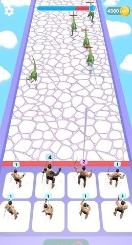 3、开始一个教学关卡,弓箭手射击恐龙获取金币,然后用金币招募更多弓箭手。