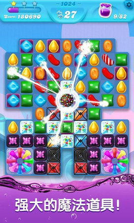 7、气泡模式:通过消除相同颜色的糖果和水瓶,提高液位,让气泡中的熊漂浮在糖果串上方完成液位。