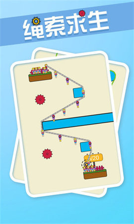 绳索求生游戏是一款非常有趣的休闲益智游戏,在这个游戏中,玩家需要用手中的绳子去营救被困的人,游戏玩法简单,容易上手,每个关卡都是精心策划和设计,有许多关卡等你挑战。