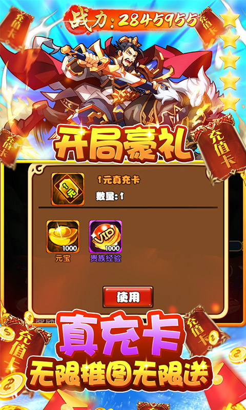 ★玩家通关战役副本真充卡无限送。线上线下充值返利齐头并进!花最少的钱,拿最牛的道具。新版本礼包内容只有你想不到。没有我们送不到!