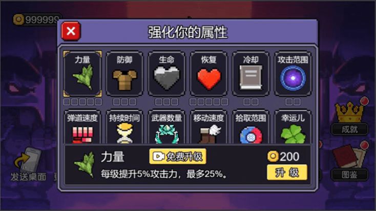 2、观看视频,你可以免费升级:每级增加5%的伤害,或每级增加25%的伤害,并投入200金币。