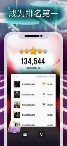 4、游戏内容丰富有趣,操作简单,通过快速敲击音符的节奏点,你可以产生播放整个摇滚乐的声音效果,曲目丰富多样,节奏变化快。