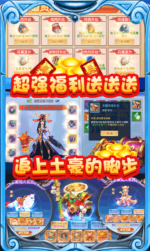 2、充值比例1:1000!首次档位充值双倍元宝,首次游戏特殊档位充值更有6倍元宝奖励,后续充值还有额外返利,更有最强的充值返利。