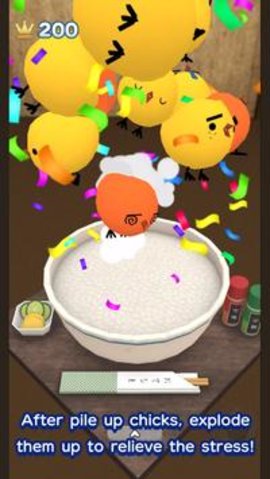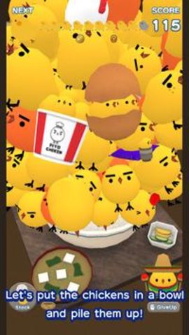 5、鸡堆是一款有趣的休闲游戏,在这个游戏中,玩家必须将尽可能多的“鸡”放入碗中,并将它们堆叠起来。游戏很简单,只要“滑动”和“按”,如果10只鸡从碗里掉出来,游戏就结束了。