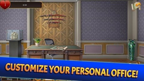 2、在美丽的城市旅行,寻找被盗物品,用家具、奖杯等装饰我们的私人办公室。