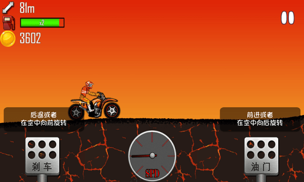 3、简单清新的游戏画面风格,只需要操作油门和刹车按钮就可以在滚动的斜坡上运行。