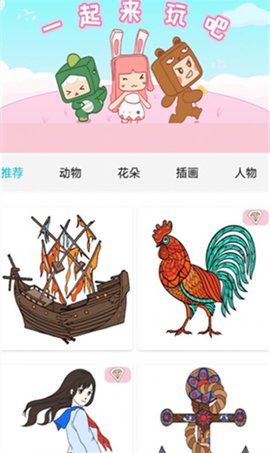 3、数字着色解压书游戏菜单栏细节,有多种类型的动物、花卉、插画、人物等可供选择,软件更新迅速,给玩家带来多种体验。