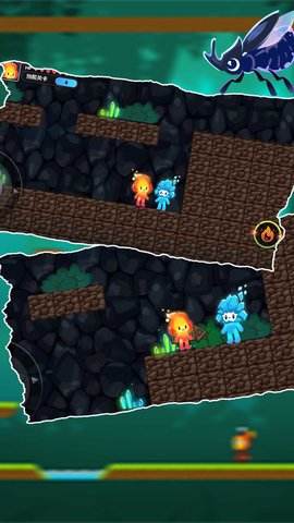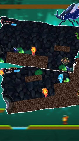 2、穿越森林,避开或消灭怪物,帮助红火人找到蓝冰人,一起安全回家