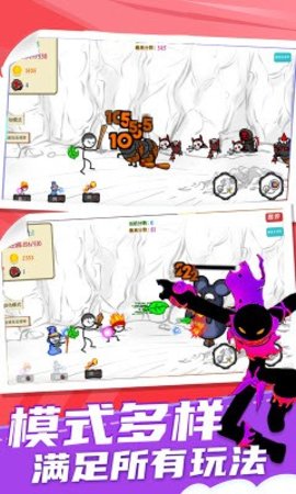 1、控制火柴人,使用武器快速击杀对面的敌人,并与同伴战斗