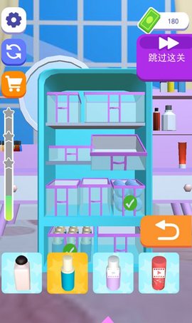 2、各级化妆品柜不同,你需要把所有的化妆品整齐地放在橱柜里,还可以使用各种道具,让你顺利通过关卡。