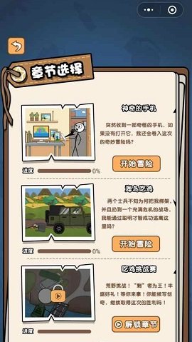 3、有神奇手机、吃岛鸡、吃鸡挑战等章节都是不同的冒险之旅。