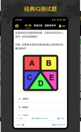 2、问题丰富,侦探、逻辑和数学、图形、立体几何、脑筋急转弯等问题在此。