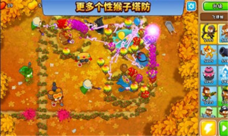 猴子:猴子就像其他塔防游戏中的防御塔。飞镖猴、回飞棒猴、大炮、图钉塔、冰猴等有很多种。