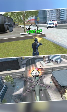 1、选择各种城市和战斗方式,在冒险中使用你的超级力量,在城市中自由奔跑。