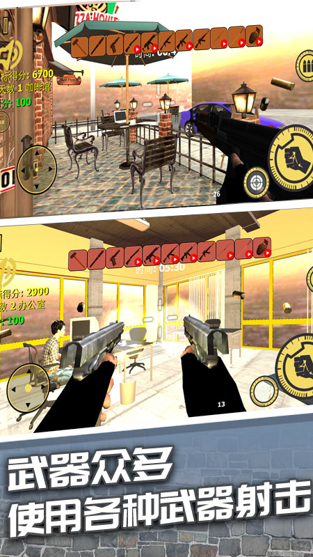 3、体验职业狙击手,摧毁房间里的一切,获得你的快感。选择你的机枪,