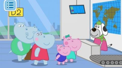 3、一个有趣的家庭正在等待他们的航班,河马决定弄清楚机场是如何运作的。亲爱的狗叔叔允许她去看。