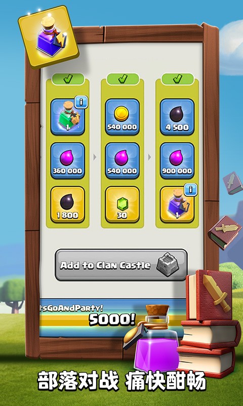 4.宝石:主要通过补给、成就奖励和清除营地杂物获得。可用于快速完成建设升级,购买建设者,直接购买金币、圣水和黑色重油。