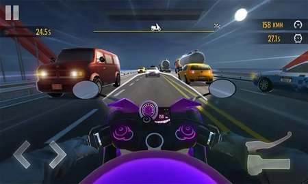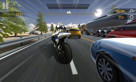 2、解锁不同关卡的摩托车越野赛对战游戏,并在高速上与大卡车飙车;