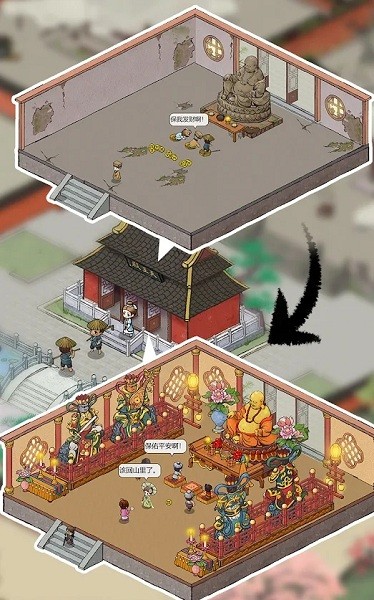 3.参与寺庙的建设:寺庙一开始很简单,但如果你努力工作,参与建设,寺庙会得到翻新。