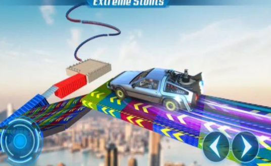 1.赛博皮卡汽车特技疯狂地骑在巨大的坡道上,巨大的彩虹灯看起来有风,给你一个不同的旅程和激情。
