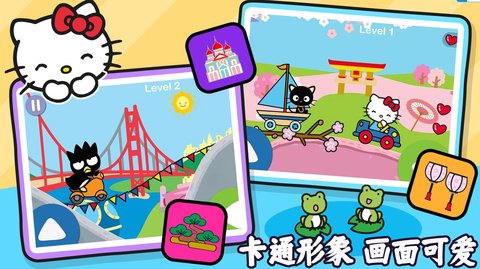 1、凯蒂猫趣味世界有大量的场景和关卡可以玩,并完成一系列有趣的驾驶冒险。