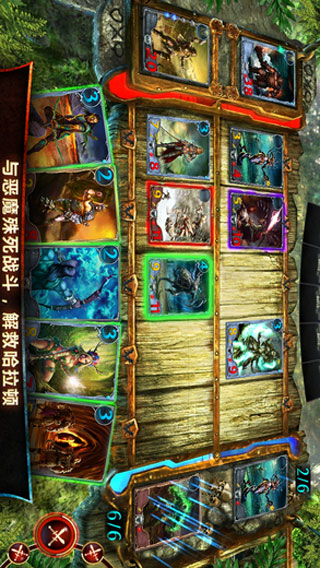 初看游戏战斗,混沌与秩序:对决有着自主的卡牌规则,牺牲和类似行动力的魔法值,让游戏具备一定策略性。前期混过了教程,绿色的卡牌随便用用也许胜利无压力,但难度的慢慢提升,想过关就不是那么容易了。当然人品也很重要,发得一手好牌,足以赢在起点。当然,加减法数学运算得过硬。四大种族,四大职业,250张角色卡、道具卡、魔法卡的多样组合,也保证了游戏的不至于单调。