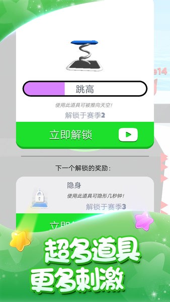 1.胜利解锁花式道具,体验更多玩法:为了赢得更多的胜利和更多的宝石,你可以进入新赛季地图,解锁各种花哨的道具,并用它们向全场展示胜利和激情舞蹈。