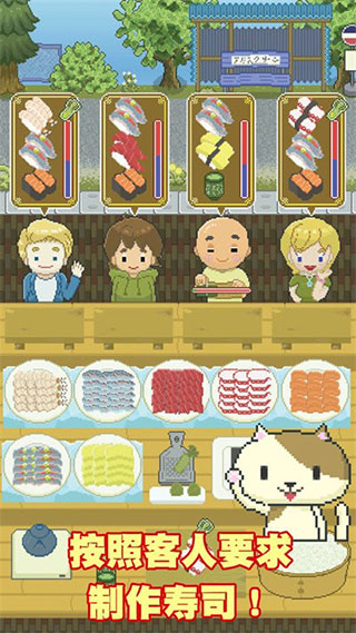 寿司小摊游戏是一款模拟在摊上卖寿司的游戏。由清新可爱的像素风格图形制成的。因为我们可以选择在寿司摊工作,所以我们需要不断满足每个客户的要求并制作相应的寿司。