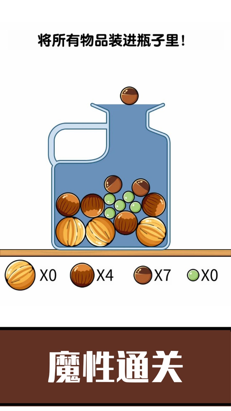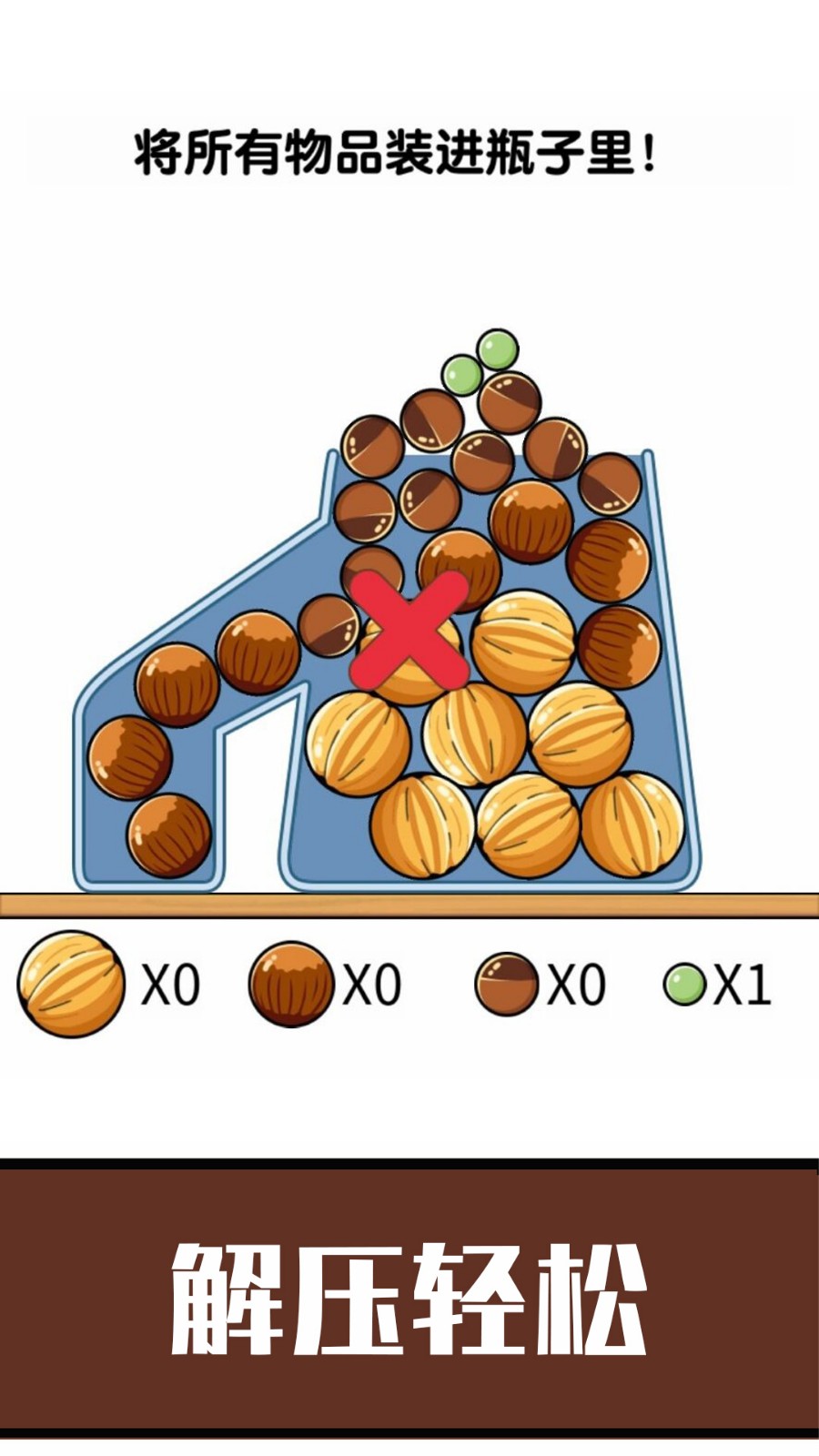 这是一款创新的休闲益智游戏。有几十个不同形状的瓶子。你需要运用你非凡的智慧,好好利用这个位置的每一分钟,把所有的干果都放进去。放松和减压,你可以和朋友和家人一起玩!