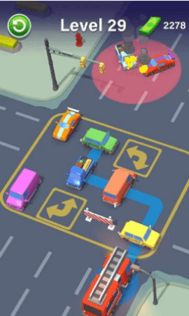 1、在车辆避让中,当发生事故时,会模拟拥挤的车辆,玩家需要以合理的顺序分流车辆。