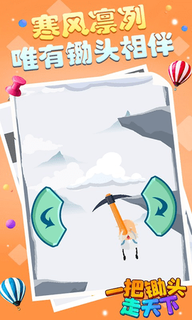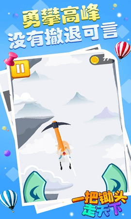 在一把锄头走天下游戏中,你将扮演一个留着白胡子的老人。您将使用锄头完成登山和登山挑战。玩家需要在游戏中使用锄头的力量钩住凸起的石头,从而获得向上攀爬并逐渐爬到最高点的力量!每次你爬到一定的高度,都是非常具有挑战性的。游戏非常简单。在这里消磨时间是合适的。你可以在各种雪山之间进行极限攀爬,勇敢前行。