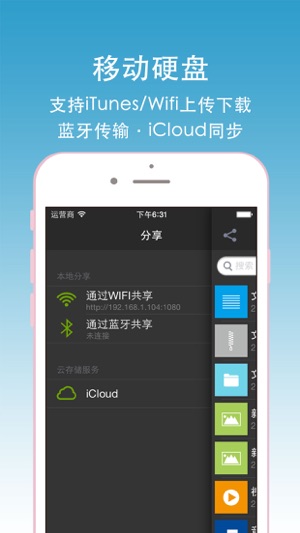 7.可以设置密码保护对App的访问,支持文件iTunes快速上传下载,支持简单迅捷的WiFi传输,支持从手机相册导入照片或视频,支持应用内部拍摄照片或视频,支持设备间蓝牙传输文件。