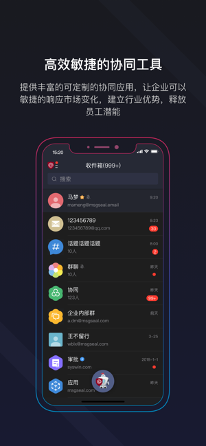 秘邮app下载后企业可以通过协作群管理团队,加密信息,存储文档,实现信息和文档的安全分享等强大的团队协同能力,还可组建高达百万人的超级大群,通过自定义身份,实现匿名化社交。