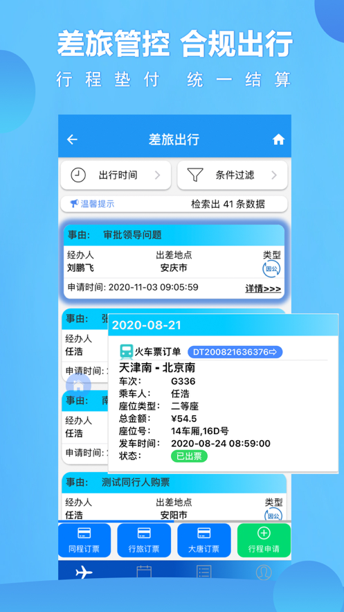 1.出差管理,按规定去旅行,垫付日程,统一结算。