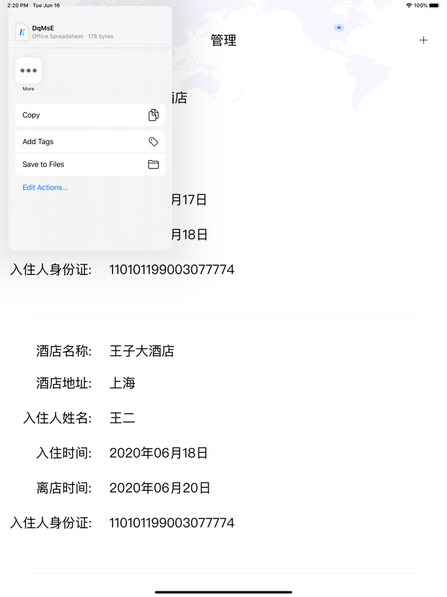 4.酒店入住情况、个人出行查询等信息都可导出手机。