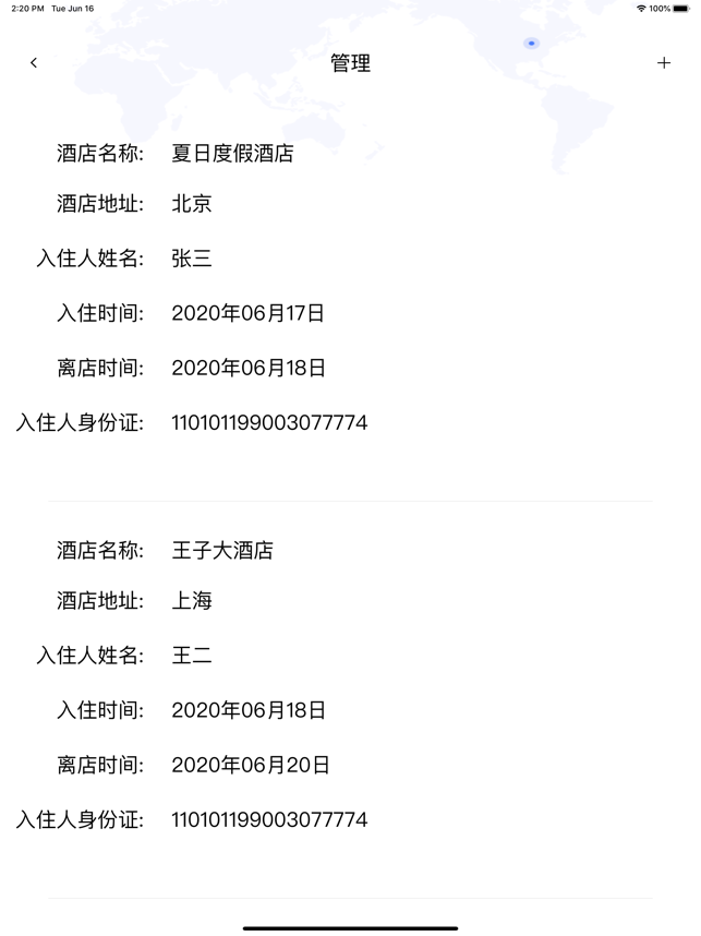 2.输入姓名和身份证可一键酒店开房记录行程信息。
