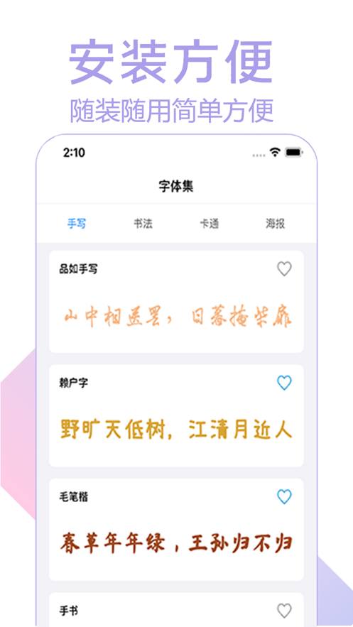 3 省流量:软件本身体积小,字体文件全部经过压缩处理,下载过程同时支持断点续传,不浪费用户一点流量。