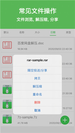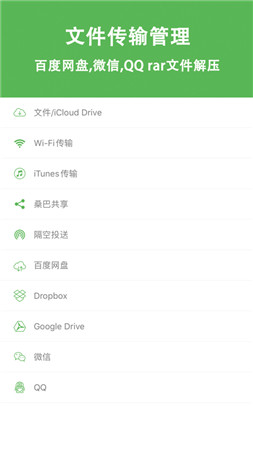 1、支持百度的磁盘、QQ、微信rar文件的解压缩。支持zip压缩文件的预览和文件管理。