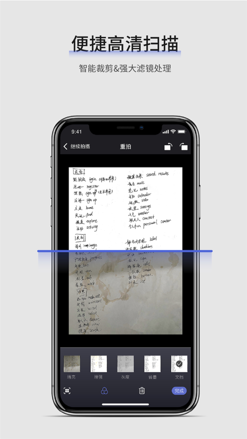 支持彩色文档处理,文档增强、增亮,文档打印、灰度、黑白等滤镜处理,生成高清图