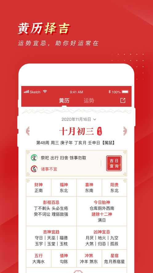 中国传统老黄历,提供择运势、宜忌、择吉日等信息历史一键查询。