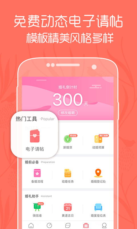 7 实用:提供12种大型婚礼工具。 如果您想邀请亲戚和朋友,则可以使用电子邀请。 如果您想了解结婚准备过程,则可以使用婚礼任务。 如果您想了解吉祥的日子,请使用婚礼吉祥的日子。 更多工具正等待您体验。