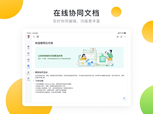 飞书文档整合即时消息、日历、音视频会议、云文档、工作台等功能于一体,成就团队和个人,更高效、更愉悦。可多人实时协同编辑的在线文档,不仅是文档,更是强大的创作和互动工具,支持丰富功能的在线表格,满足办公场景下数据统计分析等需求。